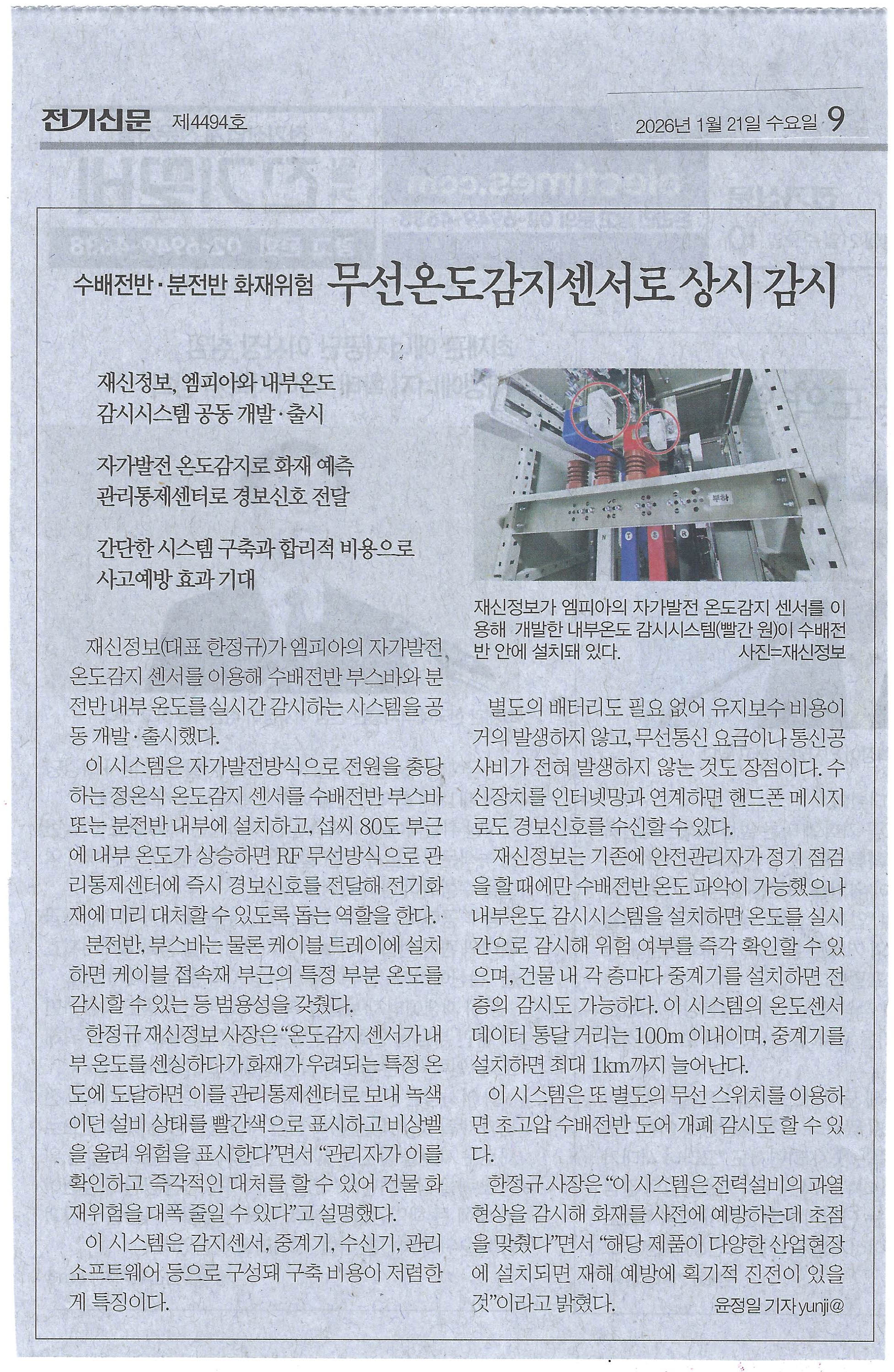 Á¦  ¸ñ : Àü±â½Å¹® 2026.01.21. 9¸é º¸µµ±â»ç - ¼ö¹èÀü¹Ý, ºÐÀü¹Ý È­ÀçÀ§Çè ¹«¼±¿Âµµ°¨Áö¼¾¼­·Î »ó½Ã °¨½Ã
